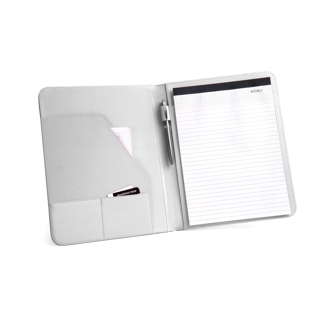 Centralnym elementem jest blok zawierający 40 liniowanych stron, który pozwala na prowadzenie notatek podczas spotkań czy konferencji. Produkt ten doskonale sprawdzi się w codziennej pracy biurowej, na warsztatach czy jako elegancki gadżet promocyjny na targach. Dostępny w kilku atrakcyjnych kolorach: błękitnym, jasnoszarym, czerwonym, jasnozielonym, pomarańczowym, teczka ta idealnie wpisuje się w korporacyjne style i markę.