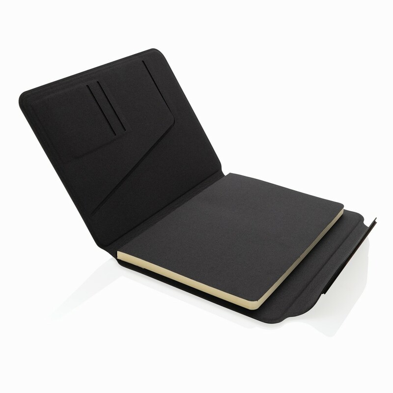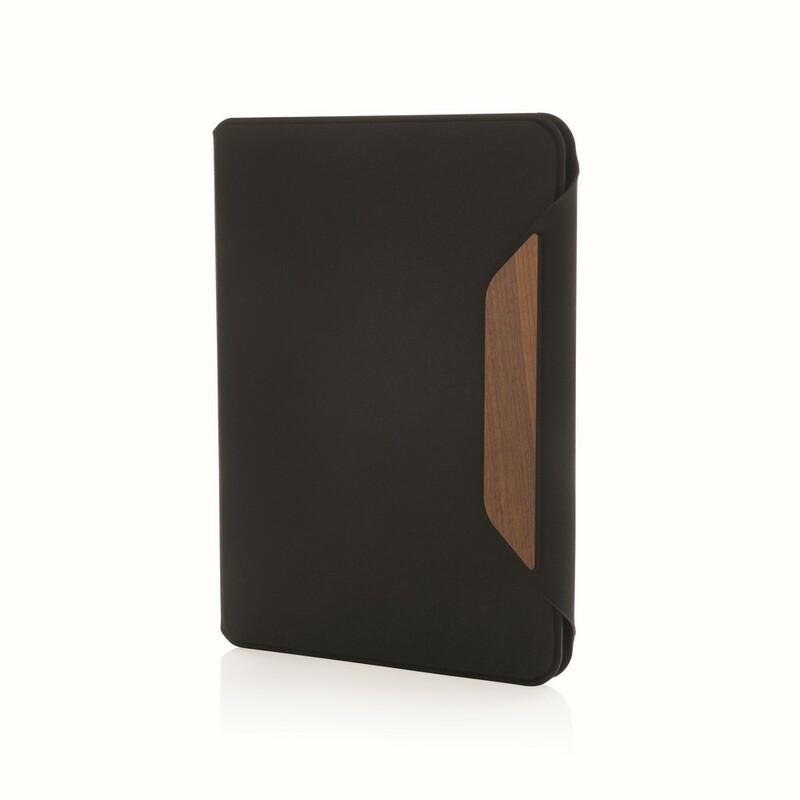 Estetyczne magnetyczne zamknięcie oraz emblemat z drewna orzechowego nadają temu produktowi niepowtarzalny charakter i elegancję, co jest szczególnie pożądane w profesjonalnych środowiskach biznesowych. Wewnątrz teczki znajdują się dwa miejsca na wizytówki, co sprawia, że organizacja najważniejszych kontaktów jest niezwykle prosta. Dodatkowo, praktyczna kieszeń na dokumenty formatu A5 pozwala na łatwo przechowywanie i szybki dostęp do potrzebnych papierów.