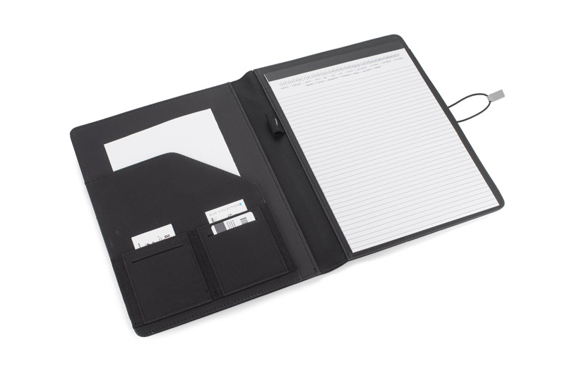 Teczka zawiera praktyczną, przestronną kieszeń do przechowywania dokumentów, dwie mniejsze kieszonki na akcesoria biurowe, a także specjalne miejsca na długopis i wizytówki, które ułatwiają organizację i sprawiają, że wszystko masz zawsze pod ręką. Dodatkowym atutem jest załączony notes o formacie A4, który może być łatwo wymieniany – idealnie nadaje się do notowania ważnych informacji podczas spotkań lub konferencji.